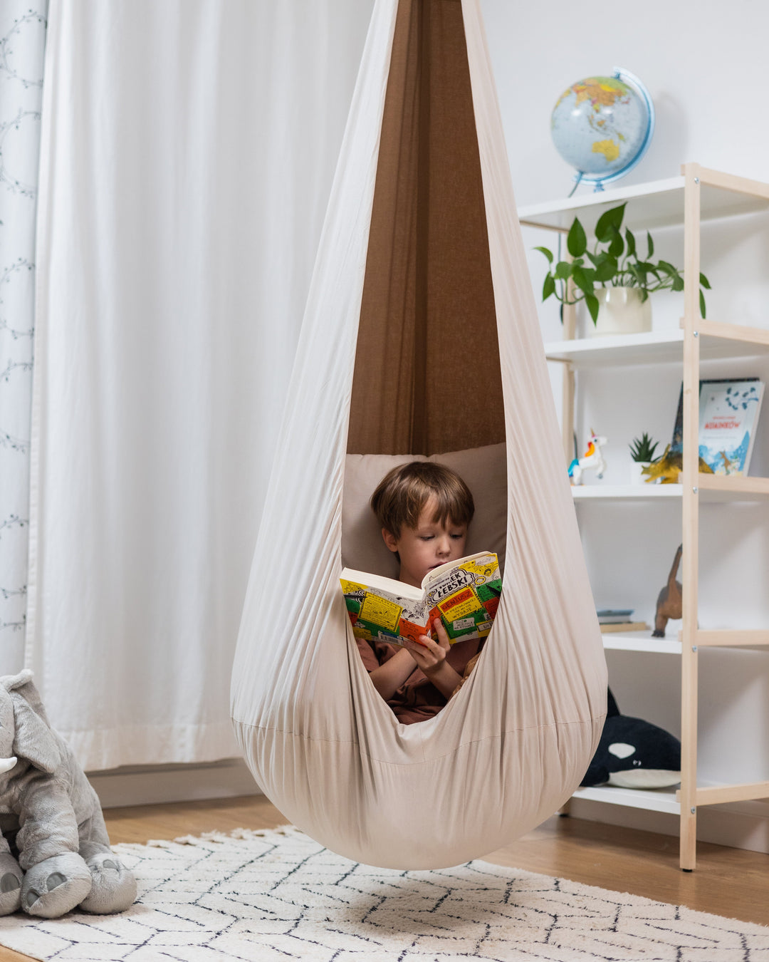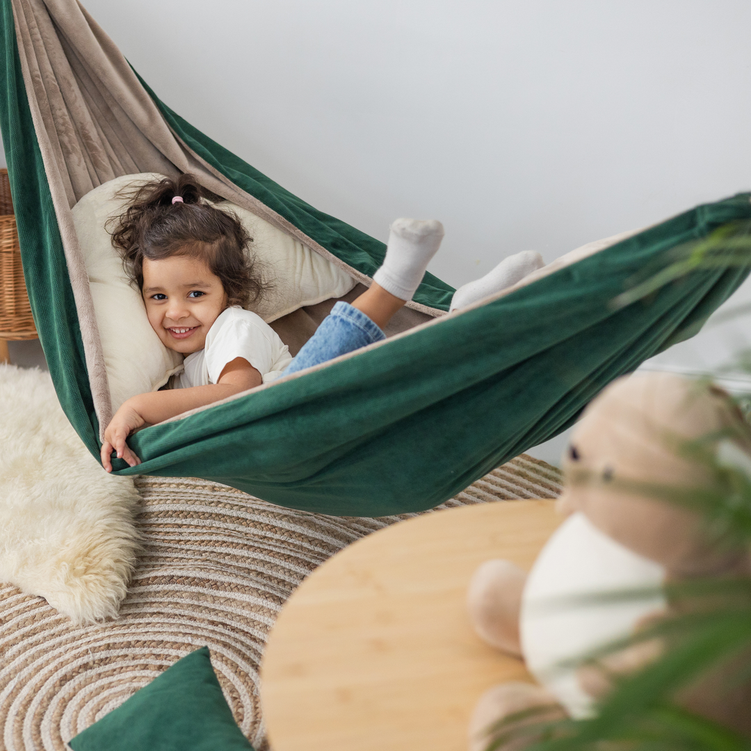 "Gentle swinging in a cocoon or hammock stimulates the vestibular system responsible for balance. It's natural sensory integration (SI) therapy that helps children with ADHD, autism, or hyperactivity."