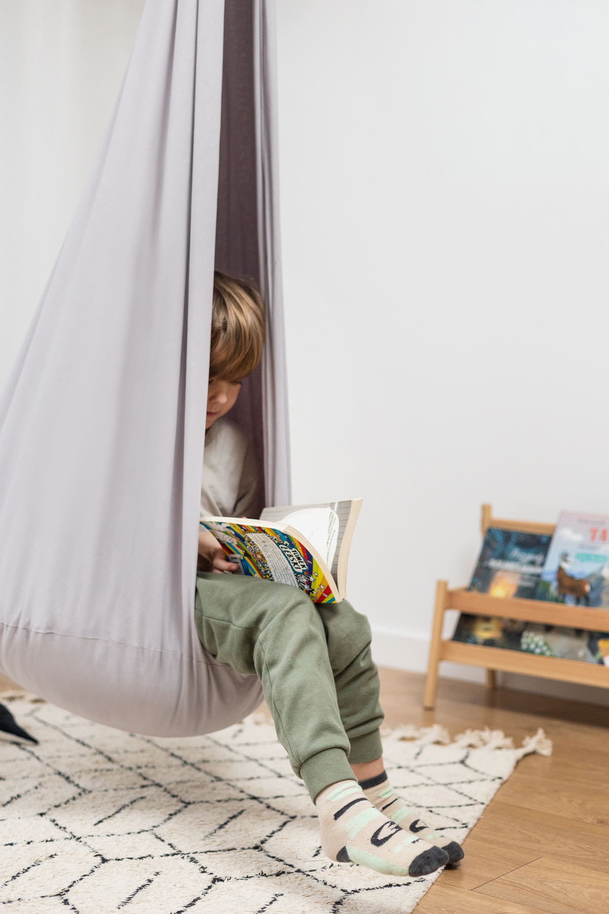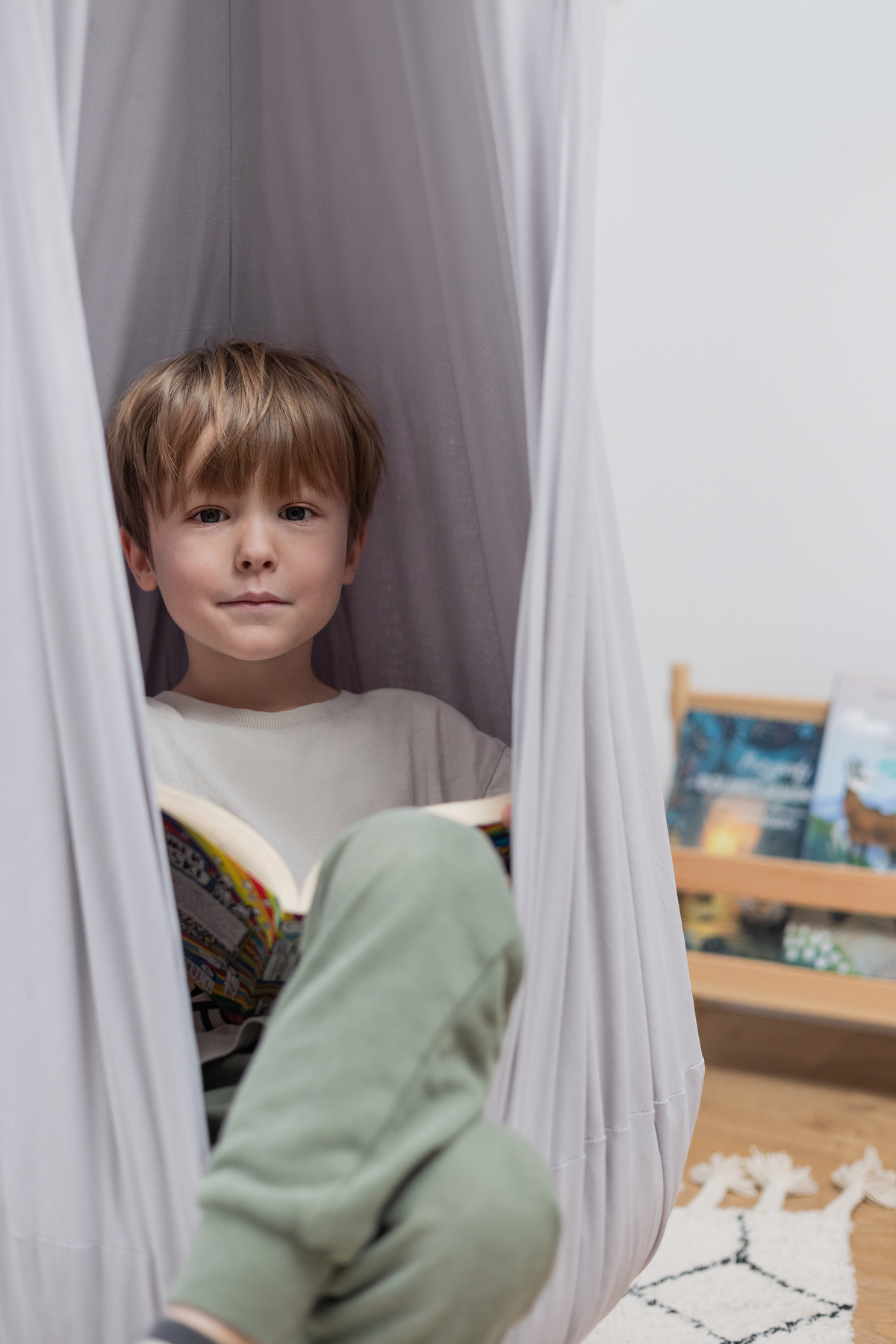 Jemné houpání pomáhá tělu zklidnit se, velký polštář na dně podpírá záda i nohy. Tady může dítě poslouchat audioknihy, stavět kostky, mazlit plyšáka nebo prostě… nic nedělat. Není to lenost – je to učení se odpočinku.