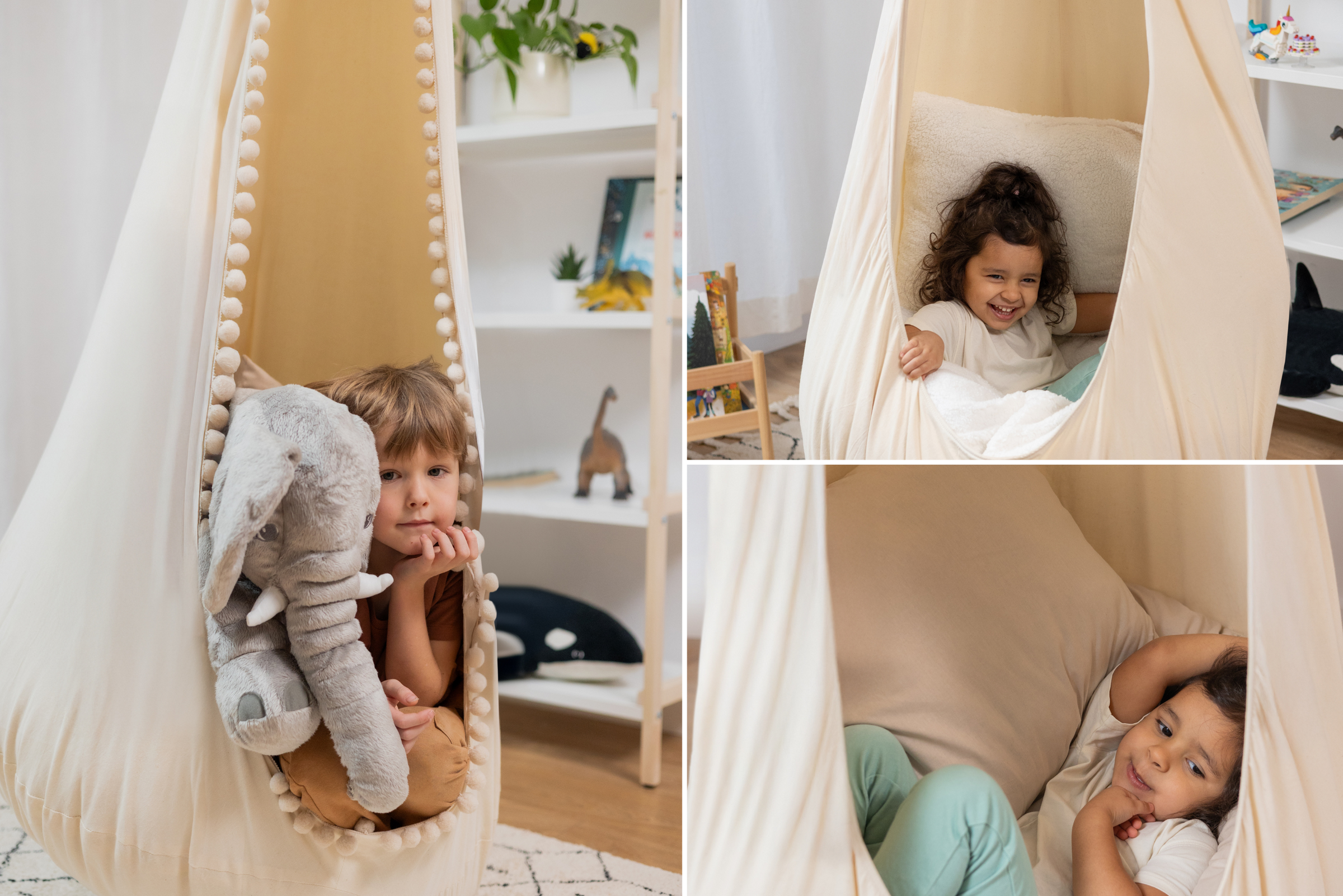 "Gentle swinging in a cocoon or hammock stimulates the vestibular system responsible for balance. It's natural sensory integration (SI) therapy that helps children with ADHD, autism, or hyperactivity."